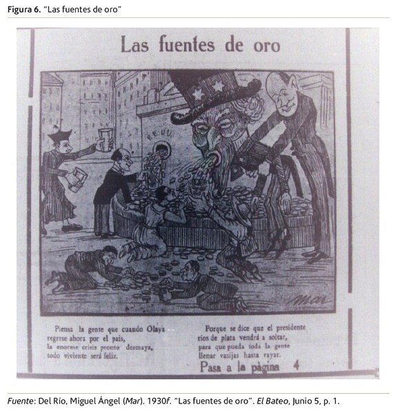 El Bateo, sobre todo a través de las caricaturas de Miguel Ángel del Río (Mar), se burlaba de las expectativas que ciertos colombianos ponían en el gobierno de la concentración nacional, pensando que futuras negociaciones con Estados Unidos redimirían a Colombia. En "El nacimiento de Quique", Mar mostraba a Colombia pariendo a Olaya; la comadrona era la concentración, la cual lucía un atuendo semejante a "la chana", mujer que personificaba La Defensa. La comadrona ofrecía el bebé a Tío Sam que le llevaba regalos: ferrocarriles, crédito y palas de vapor. El clero se asomaba por la puerta con timidez.21 Olaya Herrera trabajaba para los intereses estadounidenses. Así lo daba a entender la caricatura "Haciendo un buen trazo" donde el presidente electo, descalzo y sin etiqueta, era el ayudante del elegante ingeniero Tío Sam: Olaya, cual topógrafo, le ayudaba a tomar las medidas de nuestro territorio.22 En "La llegada de Olaya a Nueva York" Tío Sam lo recibía con un abrazo, visiblemente entusiasmado y los banqueros le ofrecían a Olaya sus bolsas llenas de dinero.23 Aquí el caricaturista hacía gala de la exageración, una de sus herramientas fundamentales. "Abultar los hechos en el sentido de ridiculizarlos" fue el objetivo de estas imágenes.24 Pero quizá la caricatura más diciente en este aspecto fue "Las fuentes de oro". El presidente electo hacía brotar dinero de las propias entrañas de Tío Sam al que le presionaba el estómago. Los campesinos, el clero y demás venían con sus vasijas a recoger el vómito, las sobras digestivas del Tío Sam: