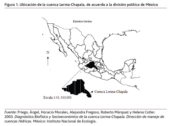 Según el Instituto Nacional de Ecología (Ine) e Instituto Nacional de Estadística y Geografía (Inegi), la cuenca Lerma-Chapala tiene un área de 53,591 km², que representa aproximadamente el 3% de la extensión total del territorio nacional y abarca territorios de cinco estados en las siguientes proporciones con respecto al área total de la cuenca: Guanajuato (43,8%), Michoacán (30,3%), Jalisco (13,4%), México (9,8%) y Querétaro (2,8%) (Ver Figura 2). La región comprendida en la cuenca Lerma-Chapala se ubica en la porción centro occidental de México. Inicia su cauce en el Nevado de Toluca, en el estado de México, atraviesa por Querétaro, abarca gran parte del estado de Guanajuato y del estado de Michoacán y culmina con la desembocadura en el Lago de Chapala, circunscrito en el estado de Jalisco. Su ubicación geográfica está definida por los paralelos 19º 05' y 21º 32' de latitud norte y por los meridianos 99º 22' y 103º 31' de longitud oeste, aproximadamente. Dicha cuenca forma de un sistema hidráulico mayo conformado además por la cuenca del río Santiago.