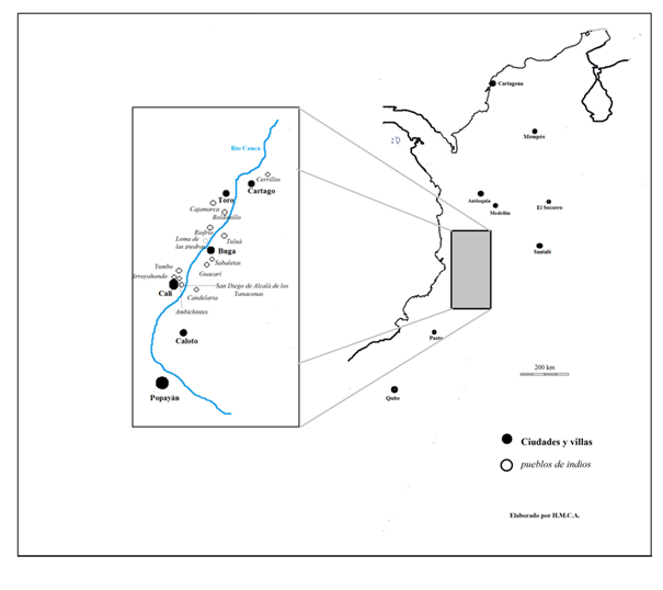 Se escogieron los pueblos con algún grado de homogeneidad de orígenes étnicos: Cerritos en la ciudad de Cartago (de origen quimbaya), Roldanillo y Riofrío (de origen gorrón) (Friede 1978; Trimborn 2005 [1949]), Yumbo (de las cercanas regiones de los Digua y Yumbillo, junto a otros migrantes),1 Arroyohondo (de Bitaco),2 y Candelaria de Caloto (posiblemente de indios guales).3 La elección de los anteriores pueblos se debe a que se evidenciaron caciques hereditarios que alegaron orígenes tradicionales y representaron rastros discontinuos de etnicidades diferenciadas. El origen patrimonial de su autoridad subsistió a pesar de los procesos de cambio iniciados en el siglo XVI y permite entender la persistencia de etnicidades dinámicas en el uso de categorías sociales y jurídicas. Se escogió el periodo de la segunda mitad de la Colonia para ubicar los antecedentes y consecuencias de un cambio que se vivió principalmente entre 1730 y 1760, y que coincidió parcialmente con las migraciones de indios forasteros en el segundo ciclo minero reseñado por German Colmenares (1997).