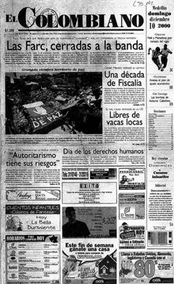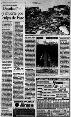 Las primeras fotografías del ataque al municipio de Granada, ocurrido el 6 de diciembre de 2000, fueron publicadas el día 8. El ataque comenzó a las 11:30 de la mañana y se prolongó por 20 horas, así que la información que circuló el día 7 fue mínima, pues las FARC retuvieron a un grupo de periodistas que se dirigía al municipio a cubrir el acontecimiento.21 Entre el 7 y el 10 de diciembre se dio un cubrimiento permanente de los hechos, tanto en la prensa regional como nacional. La dimensión de los daños como el dolor de los sobrevivientes, fueron el foco de la reportería durante esos cuatro días. El cubrimiento escrito se ocupó de distintos frentes: desde los informes parciales sobre el número de muertos y desaparecidos, pasando por declaraciones civiles, administrativas y militares, hasta la cuantía en pérdidas materiales. Es decir, un tradicional cubrimiento de la noticia en el que se entrelazan formas discursivas que buscan la objetividad del dato,22 así como otras que recurren a estrategias de la prensa sensacionalista.23 Por otro lado, la reportería gráfica se concentró en la destrucción material que dejó el asalto: cuatro manzanas en completa ruina. En suma, un cubrimiento periodístico rutinario cuya función básica, desde luego, es informar.
