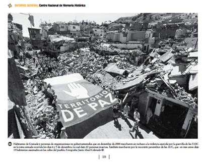 Tres días después del ataque, el 9 de diciembre, la población de Granada se movilizó en contra de la violencia de la que era objeto, tanto de las AUC como del ELN y las FARC. Jesús Abad Colorado capturó una imagen hoy en día emblemática: la de los granadinos, en medio de los escombros, marchando con una pancarta gigantesca que decía “Territorio DE PAZ”. Inicialmente, la fotografía fue publicada en la portada del periódico El Colombiano el 10 de diciembre de 2000 con las consabidas reglas periodísticas: una fotografía en medio de imágenes y textos de cualidades diferentes (figura 4). En ese sentido, la exposición de la fotografía es borrosa. El marco visual en el que se exhibe desenfoca la imagen, la subexpone: informa sobre el hecho pero no captura ni retiene la mirada; no es una imagen para el mañana sino más bien para el olvido, pues insertada en lo periódico, es decir, en lo reiterado, la obsolescencia es su destino.