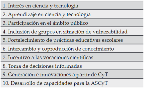 Ahora bien, el Observatorio Colombiano de Ciencia y Tecnología (OCyT), que acompaña algunos procesos de políticas públicas de ciencia y tecnología y del Sistema Nacional de Ciencia Tecnología e Innovación (SNCTeI) de Minciencias, ha evaluado proyectos y programas de ASCTI financiados o ejecutados por Colciencias y ha desarrollado metodologías e indicadores para medir o evaluar los procesos de ASCTI. Específicamente, el desarrollo de indicadores de medición de la ASCTI es el resultado de un trabajo conjunto con Maloka (museo interactivo sobre ciencia y tecnología ubicado en Bogotá, Colombia). Según este proyecto, al hablar de la apropiación «se está pensando en un cambio que ocurre como producto de una intervención específica, en este caso de la participación de alguna actividad de Maloka» (Arboleda et al., 2014, p. 25). De acuerdo con esto, los resultados parciales del proyecto arrojan que los indicadores de ASCTI no deben comprenderse como el cumplimiento de metas, sino categorías de medición con el fin de «comprender el papel cumplido por estas actividades en la democratización del conocimiento científico-tecnológico como propiciadoras de un posicionamiento crítico y situado de la ciencia y la tecnología» (Arboleda et al., 2014, p. 14).