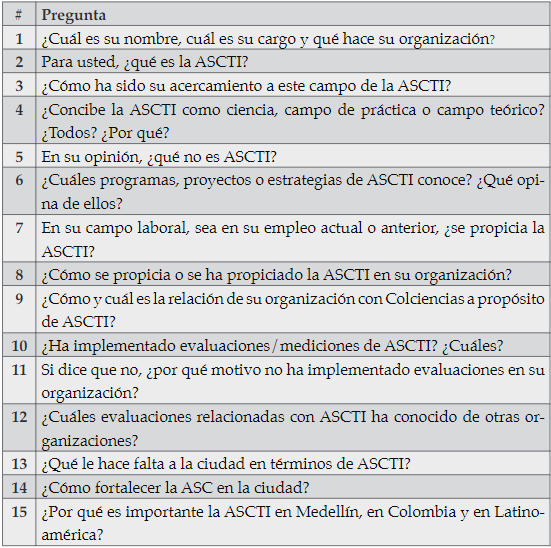 Ante las tensiones expuestas sobre cómo establecer si una actividad pertenece o no a la categoría ASCTI, y a la ausencia de evaluaciones al respecto que hayan sido probadas en diferentes escenarios y convalidadas por múltiples actores e instituciones, se consideró necesario indagar los discursos que se encuentran en el contexto de Medellín. Así, se implementó una fase de campo, ejecutada entre marzo y mayo de 2019, con dos intereses: a) recopilar y analizar algunas de las tendencias y discusiones que permean los intereses en relación con la apropiación social del conocimiento, la divulgación científica, y la comunicación de las ciencias, y, b) identificar las percepciones que se tienen en el contexto local a la hora de definir si un programa o una acción puede enmarcarse dentro de la categoría ASCTI (dentro de la cual se incluye la ASCyT).