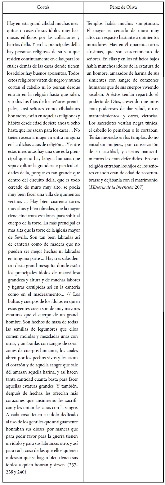 Aquí se ven con mayor claridad algunas de las diferencias en el proceder de Pérez de Oliva: en primer lugar es evidente el interés que tiene por sintetizar, pues omite elementos del relato de Cortés que al humanista le parecen secundarios; toma lo esencial de cada uno de los temas, aunque no prescinda de ninguno de ellos. En segundo lugar, cambia el orden de la exposición, centrando la atención del lector en los templos, los ídolos y los sacrificios. Pero -tal vez lo más interesante y significativo- a continuación introduce una descripción que no aparece en ningún momento en el relato de Cortés, y que en cierta medida le da sentido y coherencia a todo el fragmento. Retomando y ahondando en la cuestión de los sacrificios, dice el humanista:
