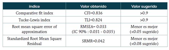 Se utilizó como estimador para la extracción de los factores el método de Mínimos Cuadrados Ponderados (WLS, por sus siglas en inglés: weighted least square) y una rotación Geomín oblicua. La bondad de ajuste del modelo de AFC se estimó mediante los índices de ajuste comparativos (CFI) e índice de Tucker-Lewis (TLI); para estos índices se han recomendados valores iguales o mayores a 0,90 para indicar un buen ajuste; también se calculó el RMSEA (Root Mean Square Error of Approximation), que debía ser menor de 0,05, y el SRMR (Standardized Root Mean Square Residual, que debía ser menor de 0,08 para indicar un buen ajuste de la estructura (C.W. de Vet H et al., 2011; Hu y Bentler, 1999).