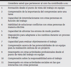 Estos cantores fueron interrogados acerca de la percepción que tenían de sí mismos en cuanto a la influencia que pertenecer a una agrupación coral había tenido en su desarrollo desde el punto de vista de trabajo en equipo sobre las categorías de mucho, bastante, regular, poco o nada (tabla 2).