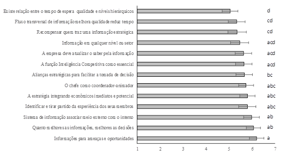 No aprofundamento dos contrastes das questões, pôde-se perceber também que as variáveis “informações para ameaças e oportunidades”, “quanto melhores as informações, mais eficazes as decisões” e “sistema de informação associar meio externo com o interno” tiveram maiores valores de média que as variáveis “existe relação entre o tempo de espera qualidade e níveis hierárquicos”, “fluxo transversal de informação melhora qualidade e reduz tempo” e “recompensar quem traz uma informação estratégica”. Esta descoberta mostra que os tomadores de decisões despertaram para o gerenciamento do conhecimento a fim de obter um impacto nas suas estratégias competitivas e melhor adaptarem-se às alterações do mercado e dos consumidores.