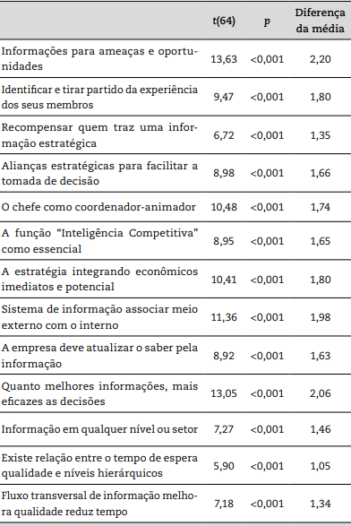 Para certificar se os gestores avaliam as questões identificadas acima do valor médio, a média de cada uma das questões foi comparada com o valor de referência 4, que é o ponto médio da escala utilizada nas questões (variou de 1 até 7). Foi considerado o índice de significância de 5%. Para o contraste foi utilizado o teste t de uma amostra. Como pode ser observado na Tabela 1, “Resultado observado através do contraste dos valores médios de cada uma das questões com o valor de referência 4”, todas as questões foram avaliadas acima do valor esperado; na mesma tabela é possível observar as variáveis que apresentaram maior ou menor diferença do valor médio da escala. Os resultados sugerem que os gestores valorizam o uso de informação acima da média, a variação observada na coluna diferença da média indica que apesar de todas as características serem bem avaliadas, algumas são mais importantes do que as outras.