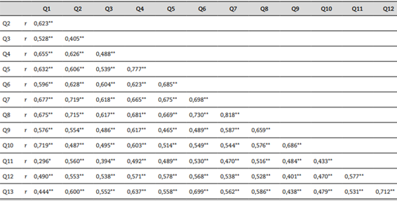 Tabela 2 Coeficientes de correlação r de Pearson (teste bicaudal) entre as questões investigadas 2017