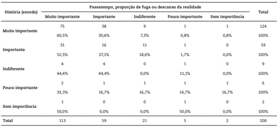 Tabela 1 História (enredo) x Passatempo, proporção de fuga ou descanso da realidade