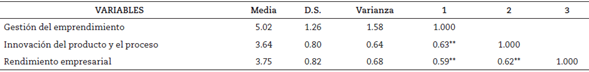 Nota: en la tabla se muestran los estadísticos descriptivos, así como la correlación entre las variables del emprendimiento empresarial, la innovación en el producto y el proceso y el rendimiento empresarial. En este sentido, se puede apreciar que las correlaciones (r) entre las variables son positivas y significativas (p<0.001), que oscilan entre 0.59 y 0.63 medidas a través del factor de correlación de Pearson (Pearson, 1931).