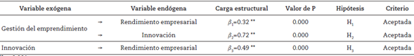 Nota: en la tabla se muestran las cargas factoriales estandarizadas (β) del modelo SEM; se analizan cada una de ellas para evaluar las hipótesis establecidas en la investigación. En este sentido, la gestión del emprendimiento tiene un efecto positivo y significativo (β1=0.32; p<0.001) en el rendimiento de las empresas industriales. De la misma manera, la gestión de emprendimiento tiene un efecto positivo y significativo (β2=0.72; p<0.001) en la innovación de los productos y procesos de las empresas industriales. Asimismo, la innovación en el producto, así como en los procesos, influye positiva y significativamente (β3=0.49; p<0.001) en el rendimiento empresarial de las pymes de la región del estado de Guanajuato.