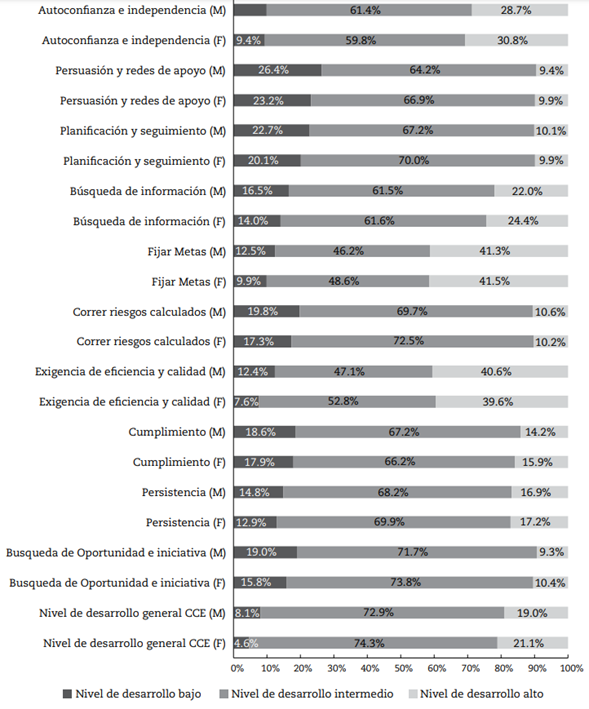 La Figura 3 refleja que la mayoría de la juventud paraguaya tiene un desarrollo medio de su conducta emprendedora. Siete de cada 10 jóvenes se encuentran en la franja de nivel de desarrollo intermedio, y dos de cada 10 sobresalen con puntajes promedio de nivel alto. Pero solo uno de cada 10 destacan en las capacidades de persuadir, buscar oportunidades, planificar y correr riesgos calculados.