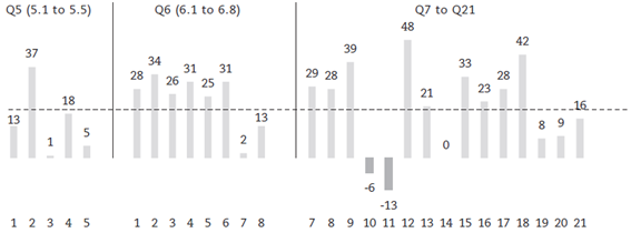 The results of the Mann-Whitney (U) test in Table 3 confirm the existence of significant differences between the two groups for most of the proposed questions (p-value <0.05 for 16 questions or 57% of the total). In addition, Figure 1 shows that the agreement levels for the group of auditors who attribute relevance to the EAR for these cases generally exceed the opposite group by more than 20 pp, reaching a maximum of 48 pp. Furthermore, and for the remaining positive cases (9 questions), the differences are between 10 pp and 20 pp for 4 cases. On the other hand, negative values can be observed as an exception for only two questions, where the difference does not exceed 13 pp (questions 10 and 11). Finally, it is worth highlighting a single case where there is a null difference (question 14).