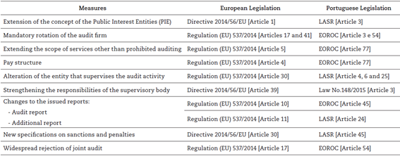 From the Portuguese legislation perspective, the transposition of the directive and the application of the regulation took place through two different diplomas, namely the Law No. 140/2015, of 7 September, which approved the new OROC statutes (Estatuto da OROC or EOROC, the Portuguese acronym), and the Law No. 148/2015, of 9 September, which approved the new Legal Audit Supervision Regime (LASR). They came into force on 1 January 2016. It is worth noting that, according to Willekens et al., (2019), Portugal can be included in the group of the 12 out of 28 Member States that, at the beginning of June 2016, had already implemented all the rules proposed by the EU into their national legislation.