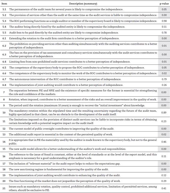 The mandatory rotation of the audit firm is another issue in which the results were not consistent, with question 10 diverging from the others. In this regard, the EAR gives Member States the option of establishing a minimum (1 year) and maximum (10 years) rotation period for the audit firm, with the possibility of an extension in the following terms: to 20 years, if applicable, a public tender process was carried out; or for 24 years, in the case of a joint audit, a possibility that was rejected by most countries. The implementation of this measure, according to what is expressed in the Green Paper (EC, 2010), will contribute to increasing independence and tends to reinforce the rotation mechanism of the partner responsible for the audit, which, by itself, does not contribute to eliminate threats from familiarity. Although the convictions were contained in the Green Paper (EC, 2010), opinions are not convergent. The studies carried out by Pereira (2016) and Ruud et al., (2018) corroborate the understanding printed in the Green Paper (EC, 2010). More specifically, the research by Polychronidou et al., (2020), for example, concluded from the perspective of the auditors that the mandatory rotation “will increase both auditor independence and resistance to the management of the audited firms”, despite the fact that it will also increase the overall costs of the audit process, which is also corroborated by Chutchev (2019). The increase in costs was also mentioned by Myntti (2019), who also indicated that the effects on the audit quality are inconclusive. These findings partially corroborate what was found by Kim et al., (2019) from the view of investors, namely that the mandatory rotation of the audit firm “provides an environment for qualified audits by enhancing auditor independence and scepticism”. However, Mestre (2016), Schönberger (2019) and Velte and Eulerich (2014) indicate that this measure will not contribute to increasing independence. Moreover, Garcia-Blandon et al., (2020), in a cross-European study and using three different sets of proxies for audit quality, did not find any evidence that companies with more than ten years with their auditors had a lower level of audit quality than other firms.