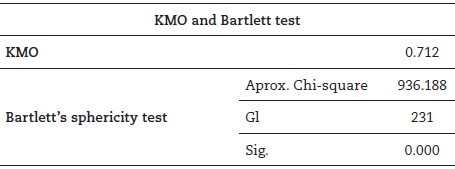 As can be seen in Table 4, the final solution has a KMO value of 0.712 and a significance level of the Bartlett test below 0.05. These results indicate, according to Kaiser and Rice (1974, cited in Hill and Hill, 2002, p. 275) and Sharma (1996, cited in Marôco, 2003, p. 368), an “acceptable” level of correlation between the variables (items/questions), demonstrating, as such, the adequacy of the factor analysis performed.