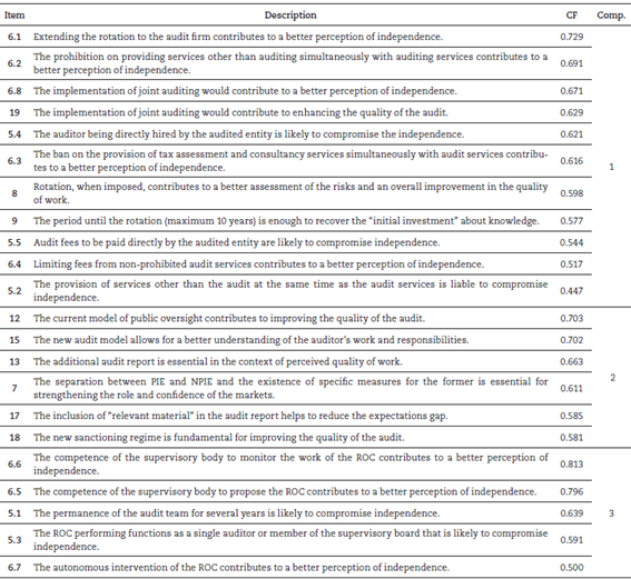 Finally, the EAR introduced several changes in terms of sanctions and penalties, namely with regard to the increase in the monetary values due for non-compliance. According to Mališ and Brozović (2017), the objective of the verified increases is to guarantee the application of the measures imposed by the EAR and these are generally adjusted to the audit market of each country. In Portugal, OROC and several audit professionals consider that they are out of place with the reality of the entities, given that the fines are substantially higher than the gross fees of the ROCs of several years (OROC, 2015; OROC, 2017). Despite this, the results obtained for question 18 show more categorically the agreement of the Portuguese auditors regarding the relevance of this measure, in line with such authors. Subsequently, the multivariate analysis started with the factorial analysis based on the principal component method with varimax rotation. This analysis was carried out in order to identify the components that explain the correlations between the different items of the questionnaire, in order to identify the underlying concepts (latent variables) of the different groupings.