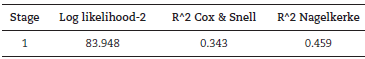 Looking at table 6, it is possible to verify that 34.3% of the variations that occurred in the logarithm of the odds ratio are explained by the set of proposed independent variables and that the model explains 45.9% of the variations recorded in the dependent variable, values that are relatively expressive. Note that this percentage is higher or close to studies that used the same technique (Chau & Leung, 2006; Nez &Cunha, 2018; Salehi & Alinya, 2017; Sharma & Siduh, 2001).
