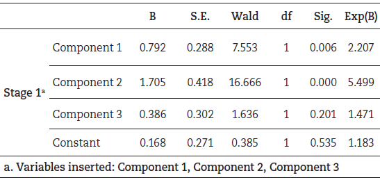 Finally, the proposed logistic regression was performed, using the three components that resulted from the previous factor analysis as independent variables. The dichotomous dependent variable is a result of a transformation proposed for the question, which aims to capture the overall relevance of the EAR from the perspective of the auditors.
