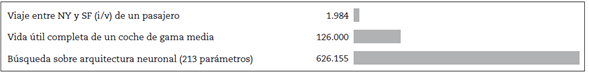 En efecto, Strubell, Ganesh y McCallum (2019) muestran una evaluación del consumo energético necesario para entrenar varios modelos de gran dimensión habituales en IA descubriendo que el proceso puede contaminar el equivalente a más de cinco veces el CO2 que emite un coche de gama media a lo largo de toda su vida útil (incluyendo la fabricación en sí), por no comparar con las emisiones que se derivan del viaje de ida y vuelta en avión de un pasajero entre dos aeropuertos estadounidenses (NYC y SFO), lo que sin duda demuestra un impacto ambiental muy sustancial (figura 3):