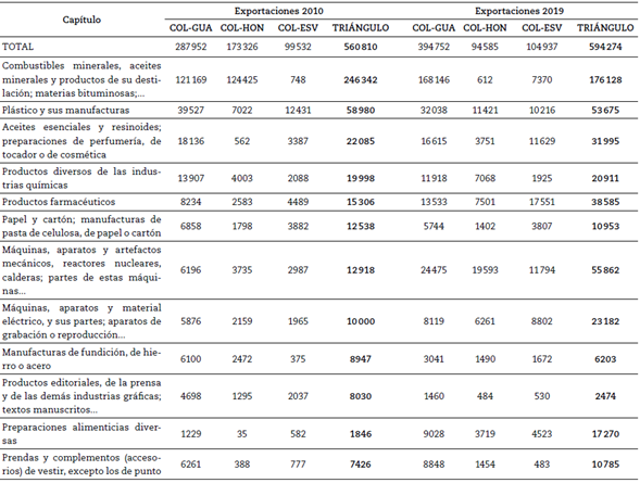 Nota: solo se presenta información para los diez productos con mayores exportaciones de Colombia a los países del Triángulo del Norte. Los últimos dos productos: preparaciones alimenticias diversas y prendas y complementos de vestir, no formaron parte de los diez productos con mayores exportaciones en el 2010, pero sí en el 2019.