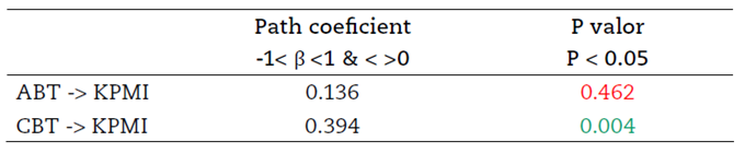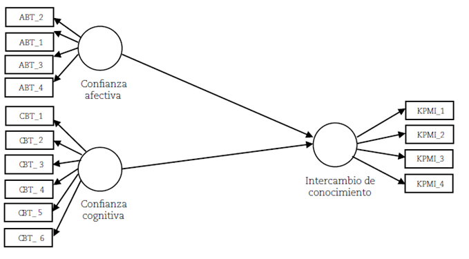 En la Figura 1 se muestra la primera representación del modelo completo conformado por cuatro preguntas orientadas a medir la confianza afectiva -denominadas ABT-, seis preguntas orientadas a medir la confianza cognitiva - denominadas CBT- y cuatro preguntas para medir el intercambio de conocimiento -denominadas KPMI-