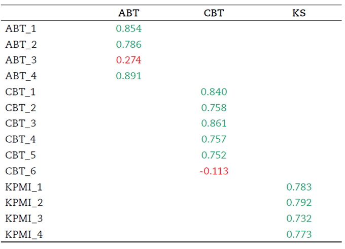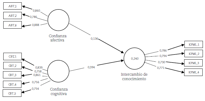 Con la representación del modelo completo, se aplican los procedimientos de análisis de datos: primero, se analizaron las cargas factoriales de todos los ítems incluidos en el modelo para descartar a aquellos con ítems con cargas inferiores a 0.7, como recomiendan Hair et al. (2019). Como se puede observar en la Tabla 4, la pregunta ABT_3, relativa a la confianza afectiva, y la pregunta CBT_6, relativa a la confianza cognitiva, no cumplen la carga factorial mínima requerida. Por tanto, las dos preguntan se excluyen del modelo y se procede a ejecutarlo nuevamente con una nueva participación para cada ítem. Resultan tres preguntas relativas a la confianza afectiva y cinco preguntas correspondientes a la confianza cognitiva. Para el caso de las preguntas correspondientes a intercambio de conocimiento, se presentan valores por encima del mínimo recomendado para las cuatro preguntas planteadas. Se procede a ejecutar el modelo nuevamente y se encuentra que todas las preguntas presentan una correcta carga factorial, según lo recomendado por Hair et al. (2019), con valores superiores al 0.7 recomendado. Los nuevos resultados se presentan en la Figura 2.