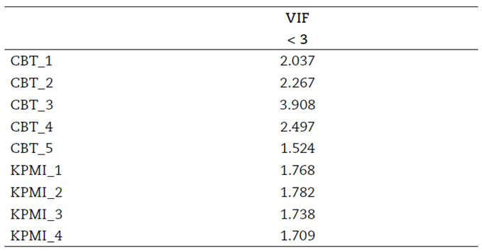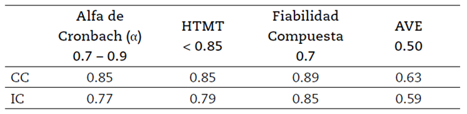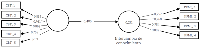 El proceso de análisis de datos con el modelo final propuesto arroja unos resultados satisfactorios. En cuanto a las mediciones del modelo reflexivo, en primer lugar, todas las cargas factoriales de los ítems CBT superaron el umbral de 0.70, lo que garantiza su fiabilidad. En segundo lugar, el modelo mostró una fiabilidad de consistencia interna aceptable. El alfa de Cronbach (α) para confianza cognitiva (CC) y para intercambio de conocimiento (IC) fue superior al umbral de 0.7 e inferior a 0.9, lo que muestra que el modelo elude la redundancia de los ítems, como recomiendan Hair et al. (2019).