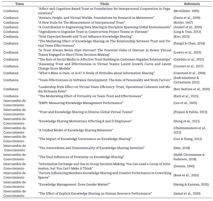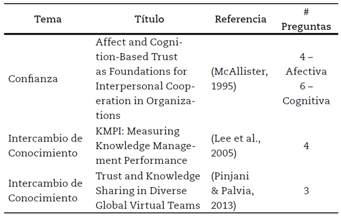 En primera instancia, se realizó una investigación de instrumentos que permitieran medir la confianza y el intercambio de conocimiento, al igual que su relación entre sí, en un equipo de trabajo. Se seleccionaron 25 artículos académicos -detallados en la Tabla 1-: de ellos, 14 se usaron para medir la confianza, y 11 para medir el intercambio de conocimiento. Luego, se seleccionaron seis de estos artículos, pues permiten medir de manera más clara el estado actual de los conceptos mencionados dentro del equipo.