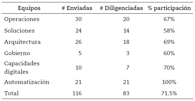La muestra seleccionada comprende seis equipos del Área de TI de la institución en la que se enfocó el estudio. Larecolección de datos se llevó a cabo mediante la distribución de una encuesta electrónica, utilizando el software Qualtrics (Qualtrics, 2022). Los instrumentos de medición fueron usados en un formulario y se enviaron al total de trabajadores del área (116 personas). Se tuvieron en cuenta variables de control género, edad, nivel educativo y el equipo de trabajo. Se recibieron 83 respuestas diligenciadas en su totalidad - una tasa de respuesta del 71.5%-. Los detalles de la muestra se muestran en la Tabla 3.