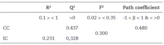 En cuanto a la evaluación del modelo estructural, primero se revisó la colinealidad. Casi todos los de VIF presentados en la Tabla 7 están por debajo del umbral de 3; sólo un valor está por encima, pero lo suficientemente cerca para no impactar los resultados (Hair et al., 2019). En ese sentido, no hay problemas de colinealidad con el modelo estructural. En segundo lugar, los valores R2 de para la variable latente endógena se consideran adecuados por estar muy cerca del valor recomendado de 0.25 (Hair et al., 2019). En tercer lugar, Q2 son valores positivos (Hair et al. 2017). La CC sobre el IC presentó una F2 que superó el umbral de 0.02, un efecto alto. En cuarto lugar, los Path coeficients (β) muestran que la CC es un importante impulsor de IC (Hair et al. 2017). Los principales resultados de la evaluación del modelo estructural se muestran en las Tablas 7 y 8.