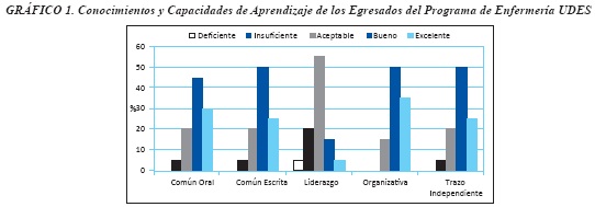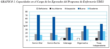 Los egresados obtuvieron una evaluación buena por la mayoría de los empleadores en el aspecto de comunicación oral y escrita, solo un mínimo porcentaje de los empleadores califico como deficiente los aspectos de liderazgo y capacidad de organización. Lo anterior deja al egresado de enfermería UDES bien posicionado teniendo en cuenta que en mayor porcentaje se presento una evaluación positiva, requiriendo reforzamiento del liderazgo temática que ha sido discutida como una necesidad para el rescate de nuestra profesión como lo expresa Villalobos en su libro El desarrollo del liderazgo y la educación en Enfermería (7).