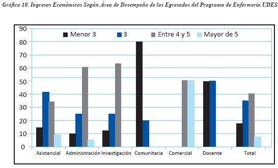 El (gráfico 10) muestra que en las áreas comunitarias, docente, asistencial se encuentran egresados que ganan menos de 3 salarios mínimos. Las áreas con mejor ingreso son: investigación, administrativo y comercial donde se evidencian ingresos entre 4 y 5 salarios mínimos. En las áreas donde se presenta el mejor ingreso de los egresados es en el área comercial.