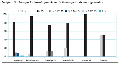Se puede observar en el (gráfico 11) que en el área asistencial, área administrativa, área investigación, área comercial, área comunitaria laboran un tiempo completo, en cuanto al área docente se percibe que trabajan en igual porcentaje menos de 1 tiempo completo y un tiempo completo.