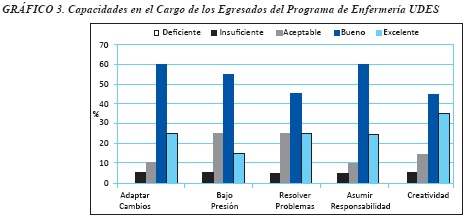 En el (gráfico 3) se observa que la capacidad de adaptarse a los cambios, trabajar bajo presión y asumir responsabilidades obtuvieron puntuaciones dentro de las categorías de aceptable, bueno y excelente, evaluadas asi por el 60% de los empleadores, mientras que la capacidad de resolver problemas y creatividad fueron calificados por un 45% dentro de las categorías de bueno y excelente. Se destaca que en todas las categorías hubo una pequeña porción (5%) de evaluadores que calificaron insuficiente.