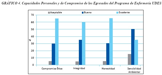 En el (gráfico 4) se observa que el 65% de los empleadores perciben un nivel de excelencia para el compromiso ético, integridad y honestidad. El 30% y 35% dan calificación buena, en cuanto a la sensibilidad ambiental obtuvo un calificación buena por el 50% de los empleadores seguido de una calificación excelente en el 35% de ellos y aceptable un 15%.
