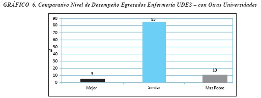 En el (gráfico 6) se observa que los empleadores opinan que los egresados del Programa de Enfermería UDES egresan igual preparados que otras universidades con un 85% y un 5% considera que salen mejor preparados respecto a otras universidades.
