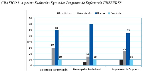 En el (gráfico 8) según los aspectos evaluados se percibe que en lo que respecta a la calidad de formación, desempeño profesional, impacto de la empresa se obtuvieron puntajes evaluados como buenos en el mayor porcentaje de los empleadores. Estos mismos aspectos obtuvieron calificaciones aceptables en menor porcentaje por parte de los empleadores. Un 10% de los empleadores opinan que los egresados tienen un desempeño excelente en estos aspectos.