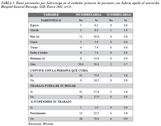 Introduction: Cardiovascular diseases are the leading cause of death in Mexico, creating a social impact persistent involving both the sufferer and those around you. Objective: To determine of level of burden in the caregiver of patients with acute myocardial infarction (AMI) in the General Hospital of Durango. Materials and Methods: A descriptive non-experimental, cross-sectional study, 54 relatives of patients admitted with a diagnosis of AMI in the Durango General Hospital, non-probabilistic convenience. Results: The average age in the study is 18 to 25 years corresponding to 37%, of which 66.7% are female, 59.3% have higher education media, 72.2% are of origin of the city of Durango, with respect kinship caregiver with care the person claiming the son is mostly with a percentage of 20.4%, also a high percentage 81.5% live with the patient and 63.0% work outside the home, and 27.8% has left the work partially, the result revealed that there is an average of 44.2% burden in the primary caregiver. Discussion and Conclusions: There are identifiable levels of burden in caregivers of patients with AMI generating a series of variables that after the patient-caregiver relationship bringing average burden.
