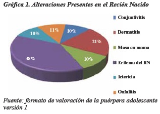 El número de recién nacidos evaluados que presentaron alteraciones de salud durante esta etapa fue de 19.4%, (Ver gráfica 1), los cuales fueron remitidos con el profesional de salud correspondiente. Dentro de los hallazgos se encontró: problemas de la piel, onfalitis y otras alteraciones como conjuntivitis, masa en mama e ictericia neonatal.