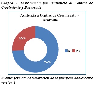 Al realizar visita alrededor de los 40 días postparto a las usuarias, se verificó que sólo el 74% de ellas habían inscrito a sus hijos en el control de crecimiento y desarrollo. (Ver gráfica 2), las puérperas que no lo realizaron refirieron que no disponían de tiempo suficiente para ir al centro de salud, que se les presentaba algún inconveniente al momento de llevarlos, no contaban con alguien que las ayudara en esta labor o que se les había olvidado que debían asistir al control en el primer mes.