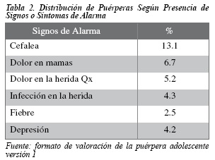 Detección temprana de determinantes de riesgo en la salud de la madre y su recién nacido. Durante las valoraciones realizadas a las usuarias se halló que un 36% de ellas presentó problemas de salud, entre los cuales se pudo observar: cefalea, dolor en las mamas; signos de infección y dolor en la herida quirúrgica. En porcentajes menores se encontraron otros signos y síntomas como: problemas de diuresis, fiebre, Hipertensión arterial y depresión leve. (Ver tabla 2).