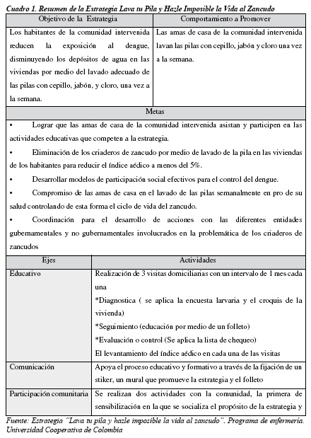 Descripción de la Estrategia "Lava Tu Pila y Hazle Imposible la Vida al Zancudo" La estrategia tiene 7 componentes como son el objetivo, el comportamiento a promover, la población objetiva, el proceso de adopción del comportamiento, metas e indicadores; 4 ejes el de educación, comunicación participación comunitaria y la coordinación interinstitucional y cada uno de los ejes en su implementación contempla unas acciones, objetivos, resultados esperados, productos, actividades, metodología e indicadores (7). Para iniciar a implementar la estrategia es necesario aplicar una línea de base que determina la conducta presente frente al comportamiento que se quiere cambiar. Estos resultados se comparan al final del proceso con la aplicación de este mismo instrumento el cual es útil y fundamental para reconocer los cambios obtenidos. A continuación en el cuadro 1 se presenta un breve resumen de la estrategia.