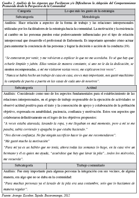 Los hallazgos obtenidos de este estudio evidencian la efectividad de la estrategia implementada, logrando que la población intervenida adoptara la conducta promovida de lavar la pila cada 8 días desde hace seis meses con agua, cepillo y jabón. Existieron unos factores que facilitaron el cambio de conducta como es la metodología, las relaciones interpersonales y la integración con los vecinos.