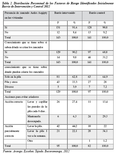 Estudio de intervención cuasi experimental, entre dos barrios de características homogéneas, en cuanto a nivel socioeconómico y geográfico como lo es el Barrio Lagos II que fue el intervenido y el barrio Lagos III que fue el de control. La muestra fue de 143 viviendas para cada uno de los barrios. El muestreo fue probabilístico sistemático y los informantes fueron amas de casa y jefes de hogar, preferiblemente encargados de las labores domésticas, que llevaran un tiempo de residencia en el barrio mayor a 2 años y que aceptaran participar en la investigación. Una vez notificados del objetivo de la investigación, aceptaron y firmaron el consentimiento informado. Para la recolección de la información se utilizó una encuesta (línea de base) que se aplicó al inicio de la intervención y 3 meses después de haber finalizado la misma de la siguiente manera: al inicio al grupo experimental y al grupo control para identificar factores de riesgo; para determinar el índice aédico se aplicó en ambos grupos al inicio y al final de la intervención; para describir los cambios en los conocimientos y en el comportamiento en el grupo experimental al inicio y al final de la intervención; además a este grupo se le aplica una encuesta larvaria, un croquis de la vivienda y una lista de chequeo durante la intervención, instrumentos que contempla la estrategia validada. Para la información cualitativa se elaboró una guía para el desarrollo de los grupos focales. A las encuestas inicialmente se les realizo una lectura crítica para buscar inconsistencias en la información, posteriormente se tabularon en forma sistematizada utilizando para ello la construcción de bases de datos en Excel y el análisis de la información según el software SPSS versión 20.0. Los resultados son presentados en tablas de distribución de frecuencias. Se utilizó el chi cuadrado con 95% de confianza, para establecer significancia estadística entre el grupo experimental y control en cuanto al número de criaderos positivos factor que determina el índice aédico y en el grupo experimental al inicio y la final de la intervención para establecer diferencias en conocimientos adquiridos y en la adopción del comportamiento. Los grupos focales, se grabaron con el fin de obtener información de calidad, y se transcribieron fielmente, recurriendo al análisis del texto, para interpretar la experiencia de los actores sociales participantes durante el proceso de intervención. Se analizaron los datos cualitativos partiendo de la identificación de patrones y temas que se repiten y sus relaciones; desarrollo de conceptos y proposiciones teóricas a partir de la interpretación de los códigos que emergen dentro del contexto, para surgir como una categoría en la que la información se agrupa de acuerdo a como emerge. Para el análisis de los costos se elaboró una matriz. En cuanto a las consideraciones éticas, esta investigación se acogió a los lineamientos de la resolución 008430 de 1993, a los lineamientos éticos establecidos en el Código de Núremberg, el Código de Helsinki, y las pautas éticas internacionales para la investigación biomédica en seres humanos, establecidas por el Consejo de Organizaciones Internacionales de ciencias Médicas (CIOMS) (10). No tiene conflicto con los principios éticos para la investigación con seres humanos y no representa riesgo para la salud o integridad de los sujetos de investigación (11).