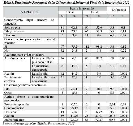 En la (Tabla 3), se observa que la población intervenida resalta la pila como el mayor criadero con un 62.8%, al inicio y un 52.6% al final, el resto manifiestan que además de la pila existen otros criaderos identificado aquí como otros y diversos como son los floreros, latas, llantas y botellas. No hay diferencia estadísticamente significativa en relación al conocimiento que tienen sobre el sitio donde pueden criarse los zancudos entre la fase inicial y final de la intervención. En relación al conocimiento sobre que hay que hacer para evitar que se críen los zancudos en la vivienda entre la fase inicial y final de la intervención, muestra que si hay diferencia estadísticamente significativa. Del total de los encuestados (n=95) en la fase inicial el 33,7% eligió la acción correcta de lavar la pila para evitar los criaderos. En la fase final el total de los encuestados n=102, definen la acción correcta de lavar la pila en un 93%, indicando con esto que en la población intervenida, los conocimientos impartidos por los facilitadores sobre el correcto lavado de la pila y los elementos a utilizar fueron asumidos dentro de su conducta promovida. Hay diferencia estadísticamente significativa en realizar la acción correcta para lavar la pila entre el grupo intervenido. En el barrio intervenido al inicio se encontraron 32 criaderos positivos para Aedes Aegipty de los cuales 27 corresponden en pilas, y 5 en otros elementos como latas, botellas, y llantas. Al final el barrio intervenido muestra una reducción en el número de criaderos positivos y el barrio control un aumento en las cifras resaltando la pila con el mayor número de positivos encontrados. Esta situación coincide con lo revisado en otras investigaciones que plantea que la pila se ha convertido en el mayor reservorio del vector (7-15). Hay diferencia estadísticamente significativa al inicio y final de la intervención en el número de criaderos positivos. En relación a la actitud asumida en el cambio de comportamiento se encontró que la población al final de la intervención se encuentra en las etapas de decisión, acción y mantenimiento, resaltando que el 93.28% asumieron la conducta de lavar la pila. Al realizar un comparativo entre los resultados iníciales se observa que las etapas de pre contemplación y contemplación que mostraban un 25.87% ya no se evidencia, lo que quiere decir que una que no mostro interés de modificar su comportamiento y 36 que estaban dispuesta a hacerlo pasaron a adoptar el comportamiento promovido. Específicamente estos resultados muestran que en la etapa de decisión hay una disminución del 2.37% pasando de pensarlo a hacerlo. En la etapa de acción la mitad de las personas que ya venían asumiendo el comportamiento pasaron a la etapa de mantenimiento, es decir que lo asumen por más de seis meses. Esta etapa evidencia un aumento considerable en relación a los datos iníciales pasando de un 23.78% a un 72,27% lo que significa que la población intervenida adopto el comportamiento convirtiéndolo en un hábito el lavado de la pila cada 8 días con agua, cepillo y jabón. Situación similar a la presentada en el estudio que antecedió este trabajo (7), en dónde el 85% de la población asumió el comportamiento ubicándose en la etapa de mantenimiento. Hay diferencia estadísticamente significativa en el número de personas que adoptaron el comportamiento promovido al inicio y al final de la intervención.