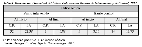 En la (Tabla 4), se observa que al inicio se encontró en el barrio intervenido un índice aédico de 22.38, es decir que de las 143 viviendas visitadas se encontraron 32 criaderos positivos para Aedes Aegipty. Al final de la intervención este índice se redujo a 5.88 pasando a tener 7 positivos para una reducción de 25 criaderos (Chi2: 22, p<0.05) lo que demuestra una diferencia estadísticamente significativa en el índice aédico al inicio y al final de la intervención y que las acciones desarrolladas con la comunidad durante 3 meses incidieron de manera positiva en la situación inicial. Con este índice sigue estando el barrio intervenido en alto riesgo de brote epidémico al tener un índice mayor al 5% en su clasificación según lo establecen los organismos internacionales (17). El índice aédico se calcula teniendo en cuenta el número de criaderos positivos en relación al número de viviendas visitadas (18).