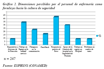 En la gráfica 1 se aprecia las dimensiones identificadas como fortalezas hacia la cultura de la seguridad percibidas por el personal de enfermería y tomando en cuenta las instrucciones de clasificación de la AHRQ, Las dimensiones que calificaron con respuestas positivas ≥ 75% correspondieron a: dotación de personal (93 %), frecuencia de eventos notificados (85 %), aprendizaje organizacional (83 %) y percepción de seguridad (79 %).