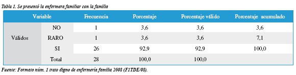 El 100% de las familias de paciente con IAM en la UCI respondieron afirmativamente que la enfermera familiar se presentó por su nombre de una manera atenta y generando un ambiente de confianza. (Tabla 1).